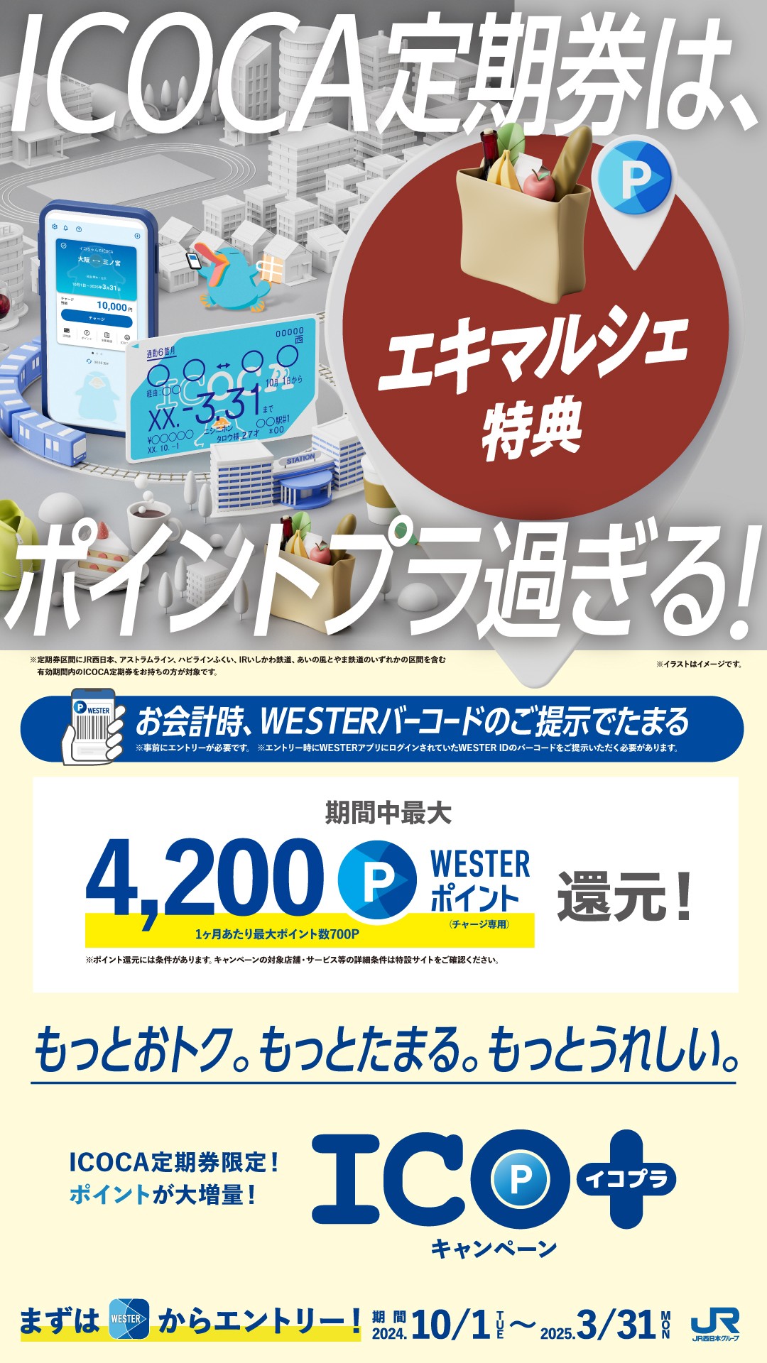 C'est avantageux par le service du JR à l'ouest le groupe et, pendant de mardi, le 1 octobre 2024 à lundi, le 31 mars 2024, réalise "ICO disponible +" (イコプラ) visant aux gens ayant le laisser-passer de banlieusard d'ICOCA.