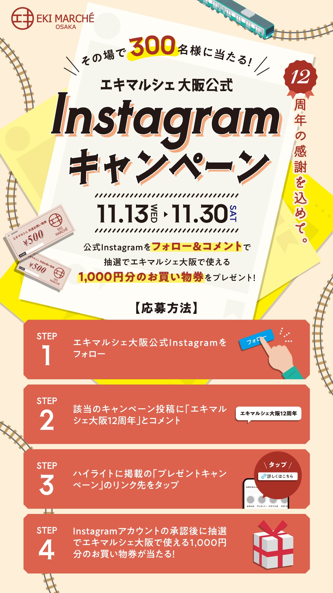 Avec un ticket de courses pour 1,000 yens pour être capable d'utiliser Instagram officielle dans l'eki marche Osaka par suivent & font des remarques, il est présent 🎁 pour 300 personnes par le sort