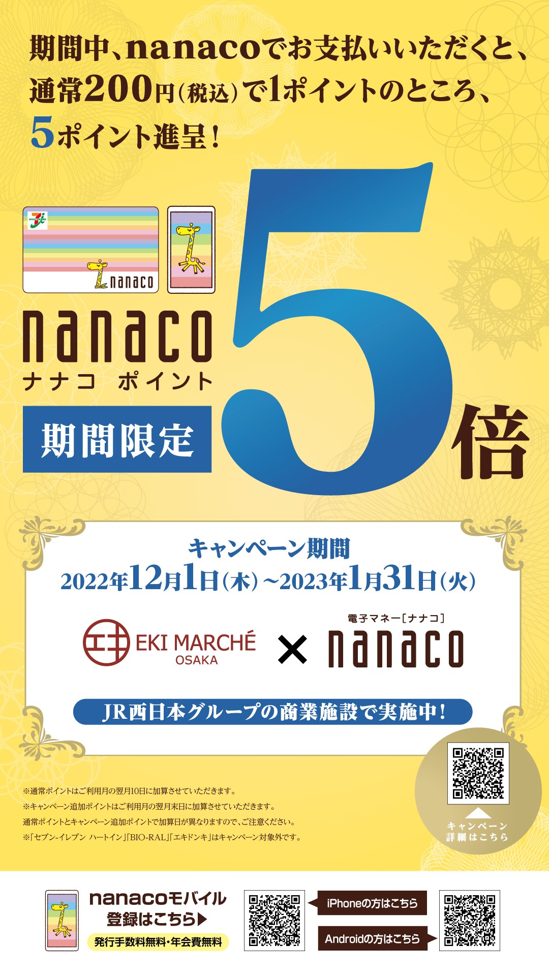 Je réaliserai une campagne pour présenter le point nanaco de 5 fois normales où je vous fais installer un compte en argent électronique "nanaco" à environ 3,000 magasins (sauf quelques magasins) de l'équipement commercial quel JR à l'ouest le groupe dirige du 1 décembre 2022.