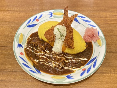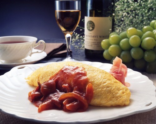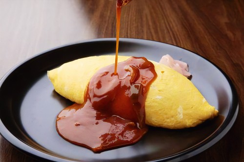 Les plats principalement sur l'omelette avec le riz bien établi à de bons vieux plats du matin, déjeuner brûlant chaud le matin ayant été continué depuis l'ère de Taisho.
