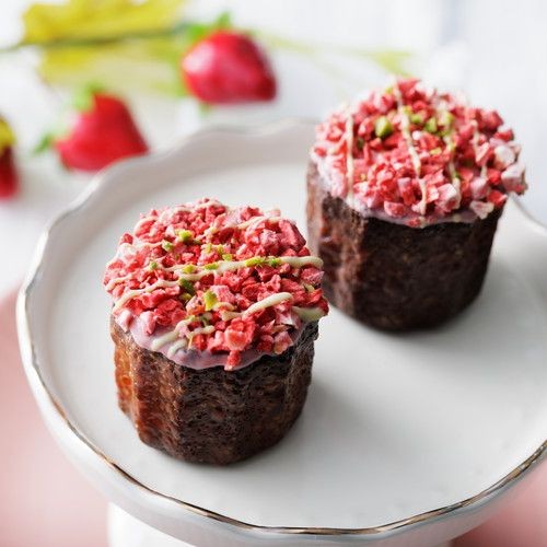 Dans cannele de Bordeaux du goût de fraises qui a utilisé du chocolat de fraises abondamment, j'ai décoré du chocolat de fraises. En outre, l'apparence qu'un bon nappage a fait une fraise sèche et la pistache que j'ai écrasée est joli cannele de Bordeaux.