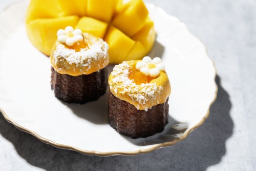 Je l'ai fini dans bon cannele de Bordeaux maintenant en été en utilisant la mangue saisonnière. Au tissu pour la mangue de la douceur fondant complètement, c'est un nappage avec la confiture de mangue. Comment du cannele de Bordeaux quel une noix de coco a un mignon dans l'apparence de l'accent à un présent ?